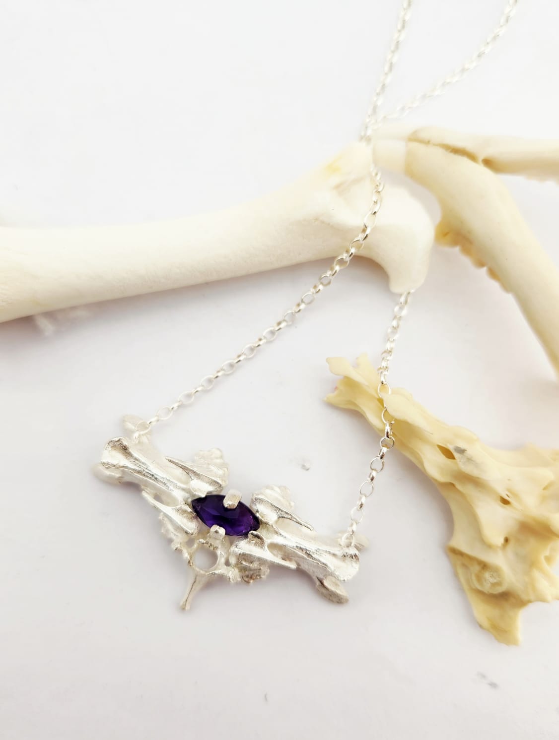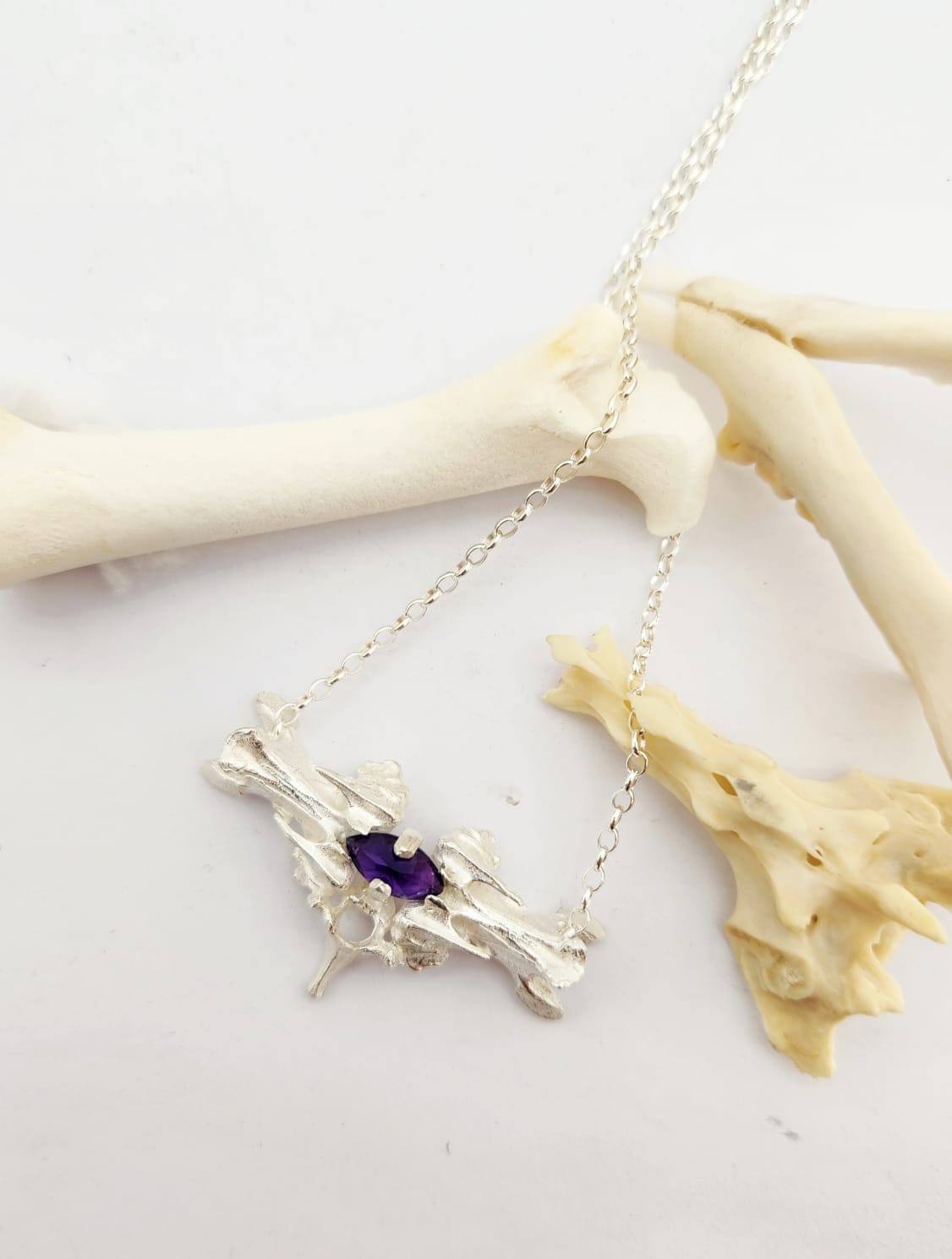 From local artist Disintegration - a solid sterling silver pendant created ethically sourced bones which have been cast into precious metal and set with a vibrant amethyst gemstone.