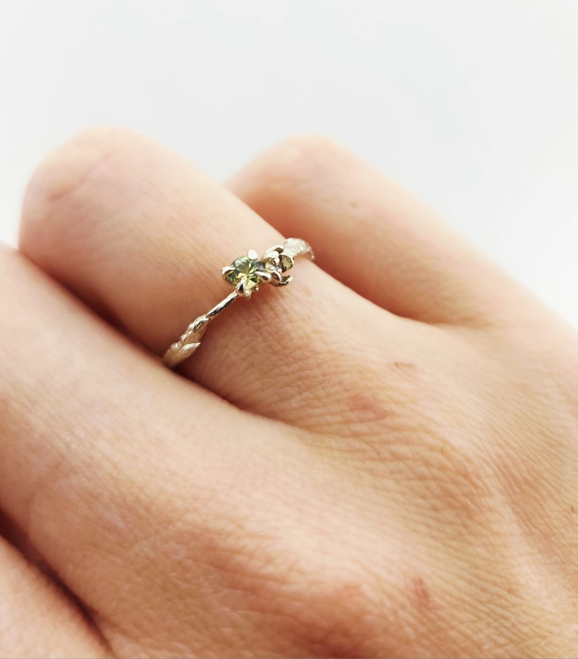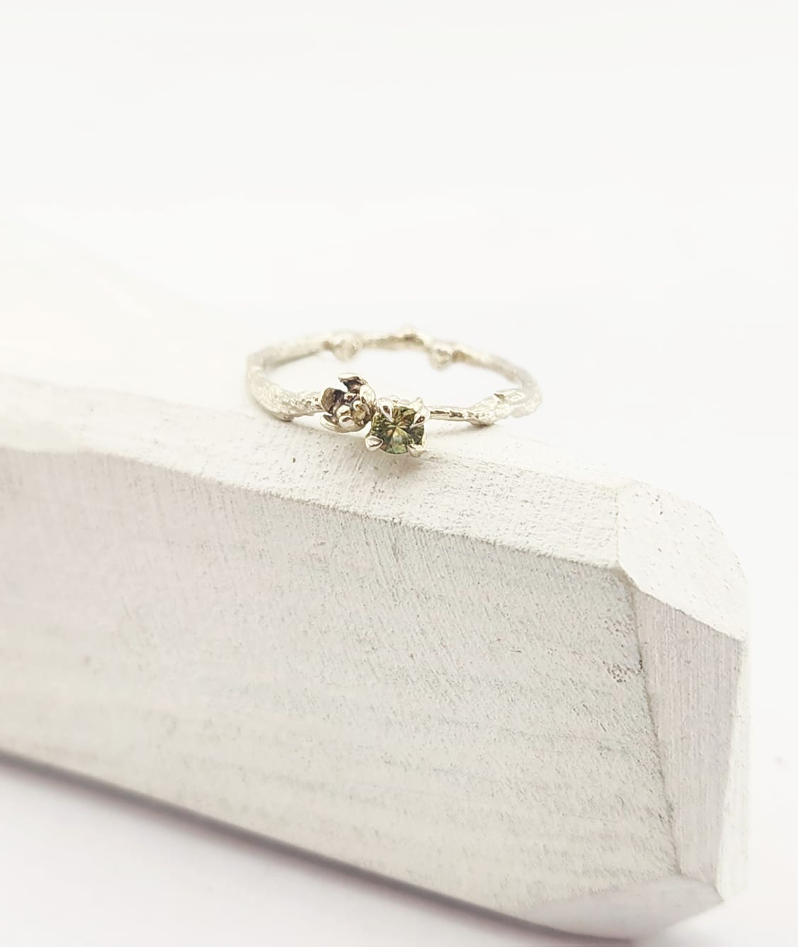 Robust yet delicate, bold yet dainty, this one of a kind Briar Flowered Ring from Natalie Salisbury features 9ct white gold band set with a beautiful parti-sapphire (blue/yellow).