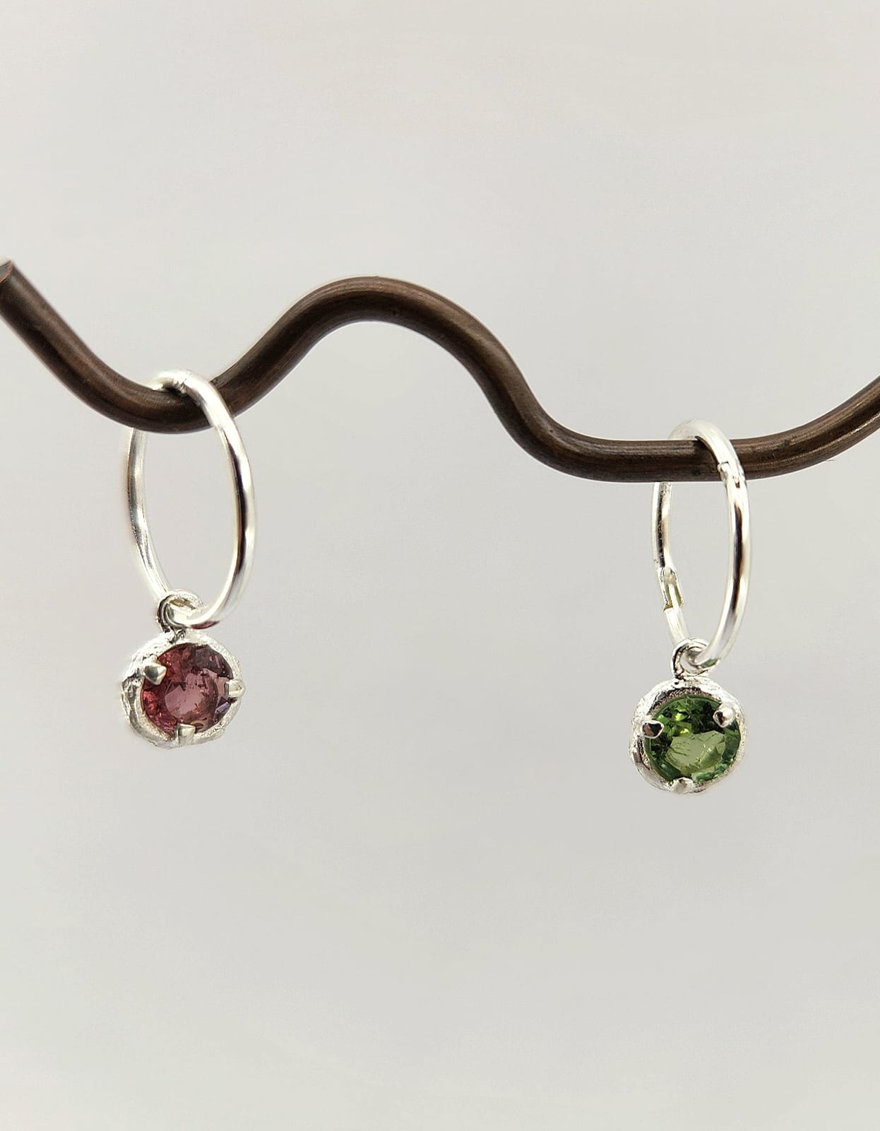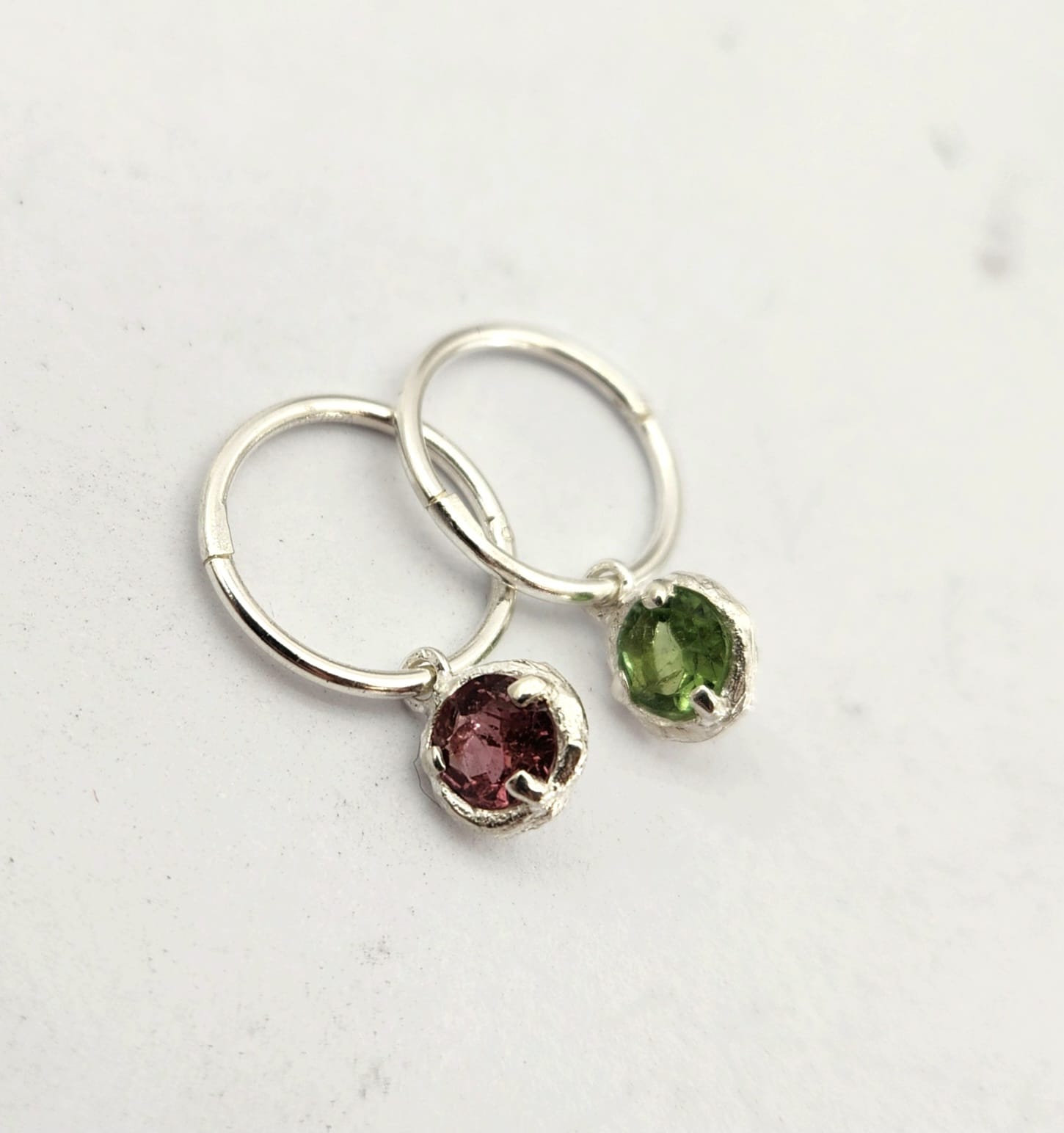 From Natalie Salisbury's Briar collection, a pair of unique earrings featuring claw set tourmaline gemstones - one green and one pink.