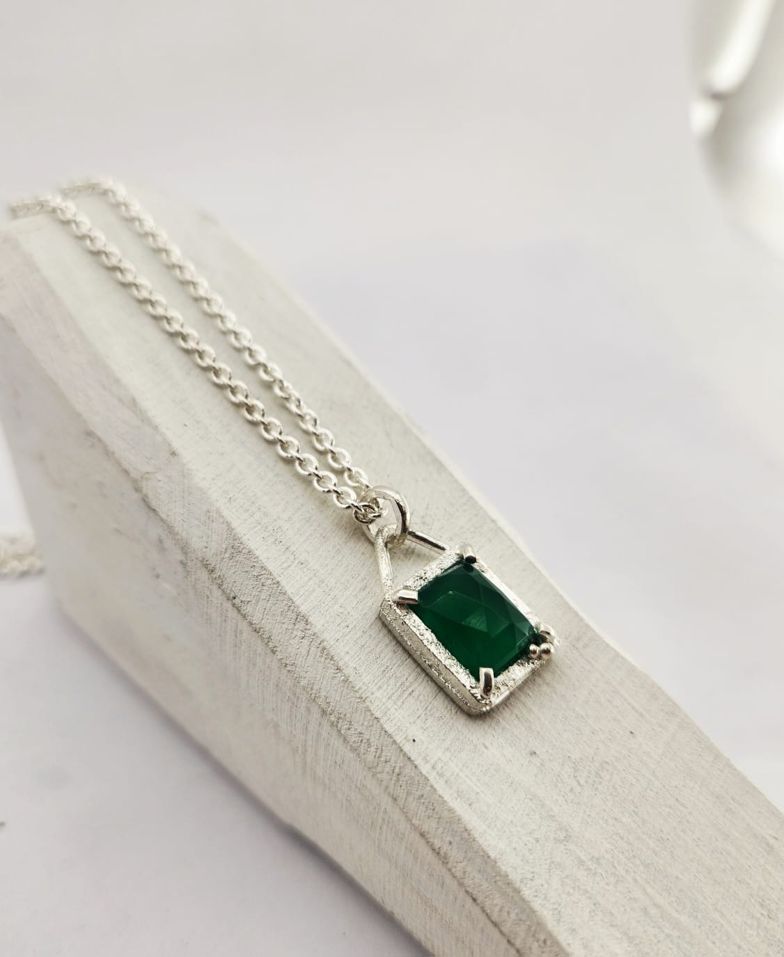 A one of a kind necklace from Natalie Salisbury, featuring a rectangular green onyx gemstone set in sterling silver.